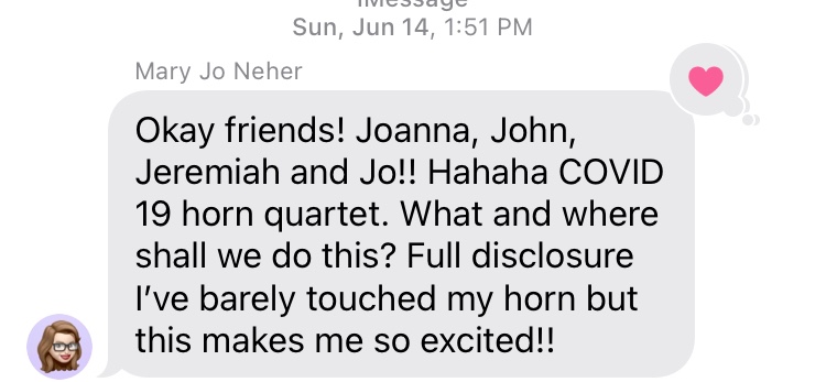 We are four professional musicians who all play the horn (commonly called the french horn). Three months into the pandemic we all responded to a suggestion to meet outdoors and make some music, just to feel normal for an afternoon. On June 14th we gathered in a backyard…and the rest?